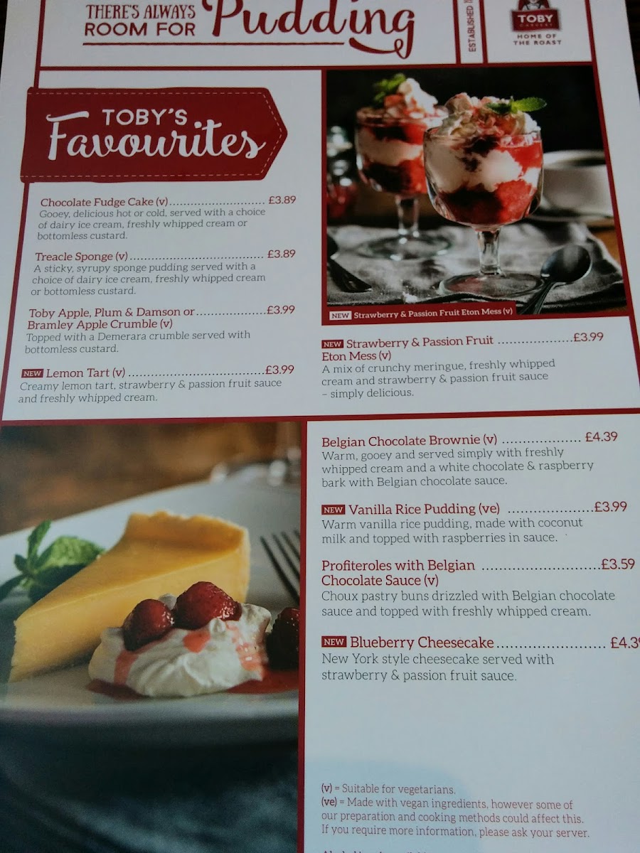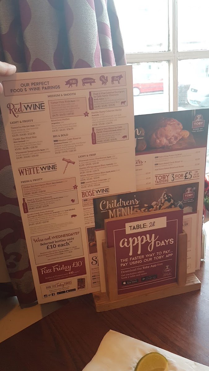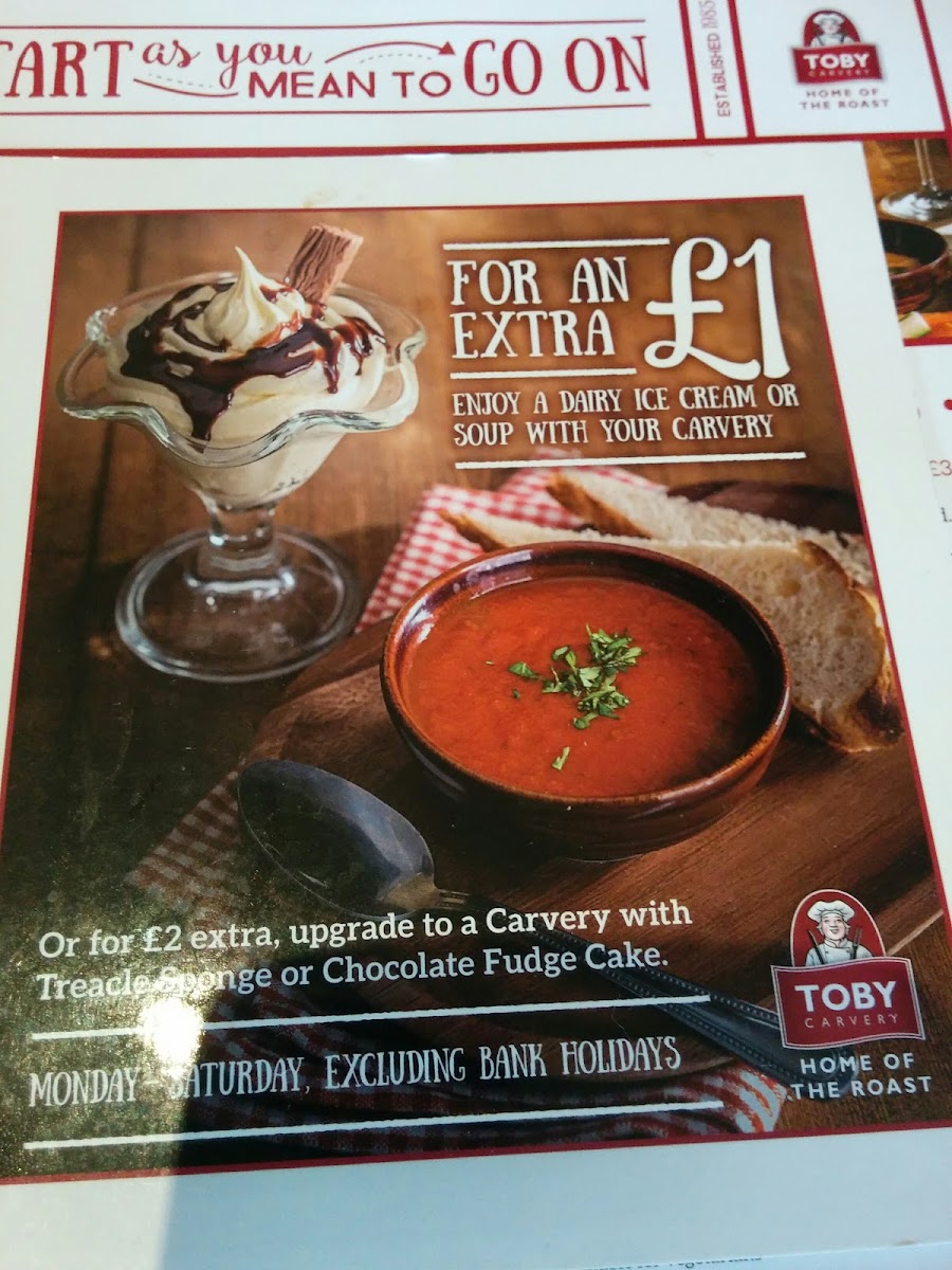 The menu showcases their famous carvery, featuring succulent meats like juicy lamb and beef, complemented by traditional accompaniments such as crispy roast potatoes and perfectly baked Yorkshire puddings. For starters, try Toby's Soup of the Day or indulge in delectable homemade pork crackling with apple sauce.